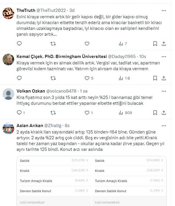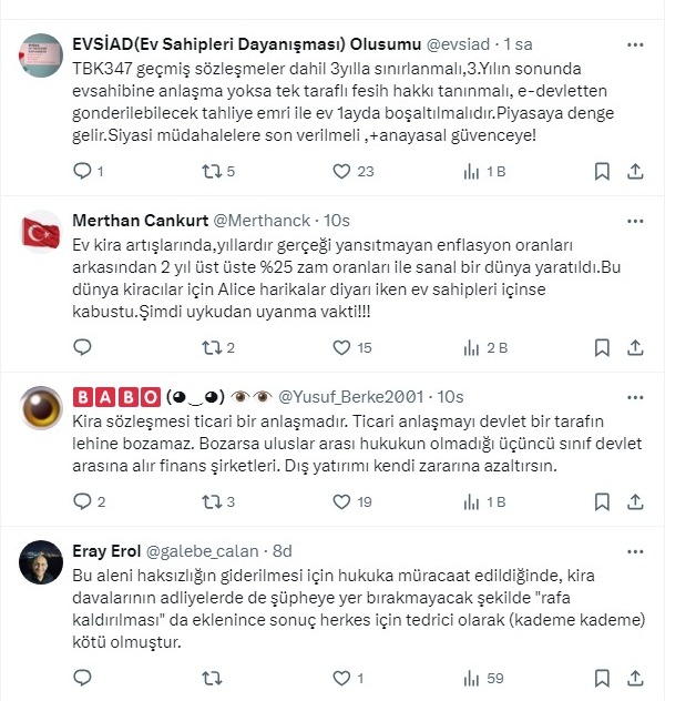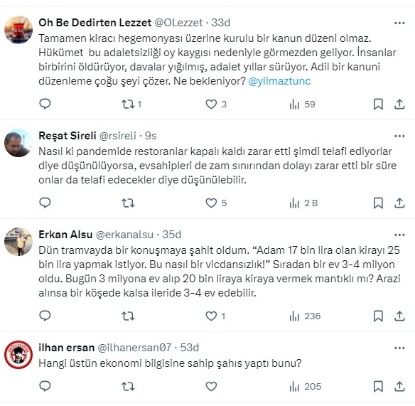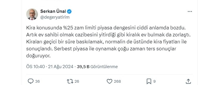 Ünal, “Kira konusunda yüzde 25 zam limiti piyasa dengesini ciddi anlamda bozdu. Artık ev sahibi olmak cazibesini yitirdiği gibi kiralık ev bulmak da zorlaştı. Kiraları geçici bir süre baskılamak, normalin üstünde kira fiyatları ile sonuçlandı. Serbest piyasa ile oynamak çoğu zaman ters sonuçlar doğurur" dedi. Takipçilerinden kiracılar için Alice Harikalar Diyarı’nda döneminin bittiği yorumları geldi.