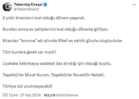 Türkiye'nin 1 numaralı emlak ve konut editörü Tebernüş Kireçci, 2 yıllık süreci sosyal medya hesabından değerlendirdi. Kireçci, yeni dönemde ev sahiplerinin kral olduğu döneme giriş yapılacağını açıklayarak yaşanan onca soruna dikkat çekti. Kireçci, ev sahibi ve kiracıların bu süreçte adeta birbirlerine düşman olduğunu söyleyerek ''Tüm bunlara gerek var mıydı?'' diyerek sitem etti. İşte Kireçcci'nin o paylaşımı ve gelen yorumlar...