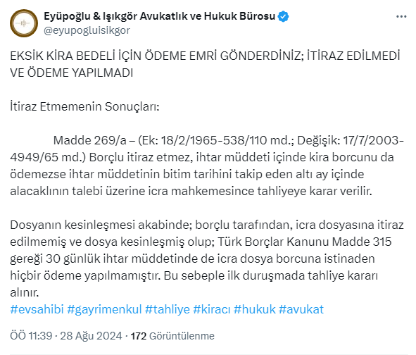 Eyüpoğlu & Işıkgör Avukatlık ve Hukuk Bürosu, eksik kira ödeyenler için ilk olarak ödeme emri gönderilmesini ardından itiraz edilmemesi ve ödeme yapılmaması halinde ne olacağını açıkladı. İşte Eyüpoğlu & Işıkgör Avukatlık ve Hukuk Bürosu'nun sosyal medya hesabı X'ten yaptığı o açıklama ve gelen yorumlar...