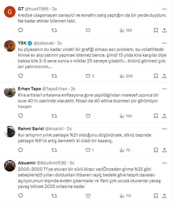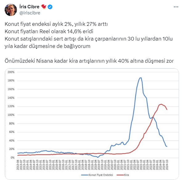 Cibre, kiracıların merak ettiği ''kira bedelleri ne olacak; düşecek mi, yükselecek mi?'' sorusuna ise ''Önümüzdeki Nisana kadar kira artışlarının yıllık 40% altına düşmesi zor.'' cevabını verdi. İşte Cibre'nin sosyal medya hesabı X'ten yaptığı o paylaşım...