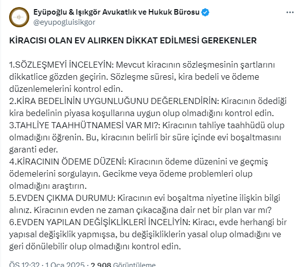 Eyüpoğlu & Işıkgör Avukatlık ve Hukuk Bürosu sosyal medya hesabından kiracısı olan ev alırken dikket edilmesi gereken 6 maddeyi açıkladı.