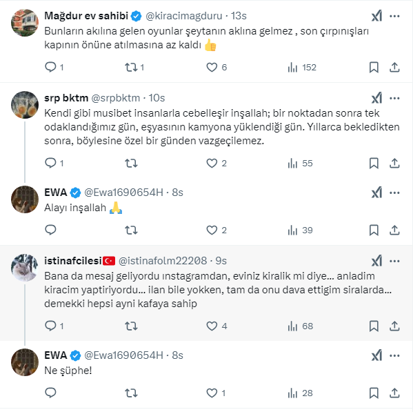 Tahliye olacağını anlayan kiracı, ev sahibinin ilanda olmayan evini almak istemesi üzerine, ev sahibi ''Hiçbir şekilde ilanda olmayan evim için bilinmedik bir numaradan evimi satın almak istediğini söyleyen X kişisini senin görevlendirdiğini anlamam on saniyemi almadı. '' diyerek kiracının oyununu ortaya çıkardı.