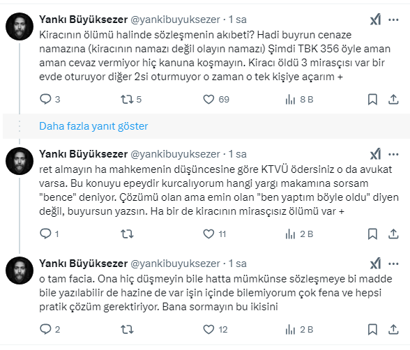 Çözümü olan ama emin olan "ben yaptım böyle oldu" diyen değil, buyursun yazsın. Ha bir de kiracının mirasçısız ölümü var, o tam facia. Ona hiç düşmeyin bile hatta mümkünse sözleşmeye bi madde bile yazılabilir de hazine de var işin içinde bilemiyorum çok fena ve hepsi pratik çözüm gerektiriyor. Bana sormayın bu ikisini...'' diyerek cevap verdi.