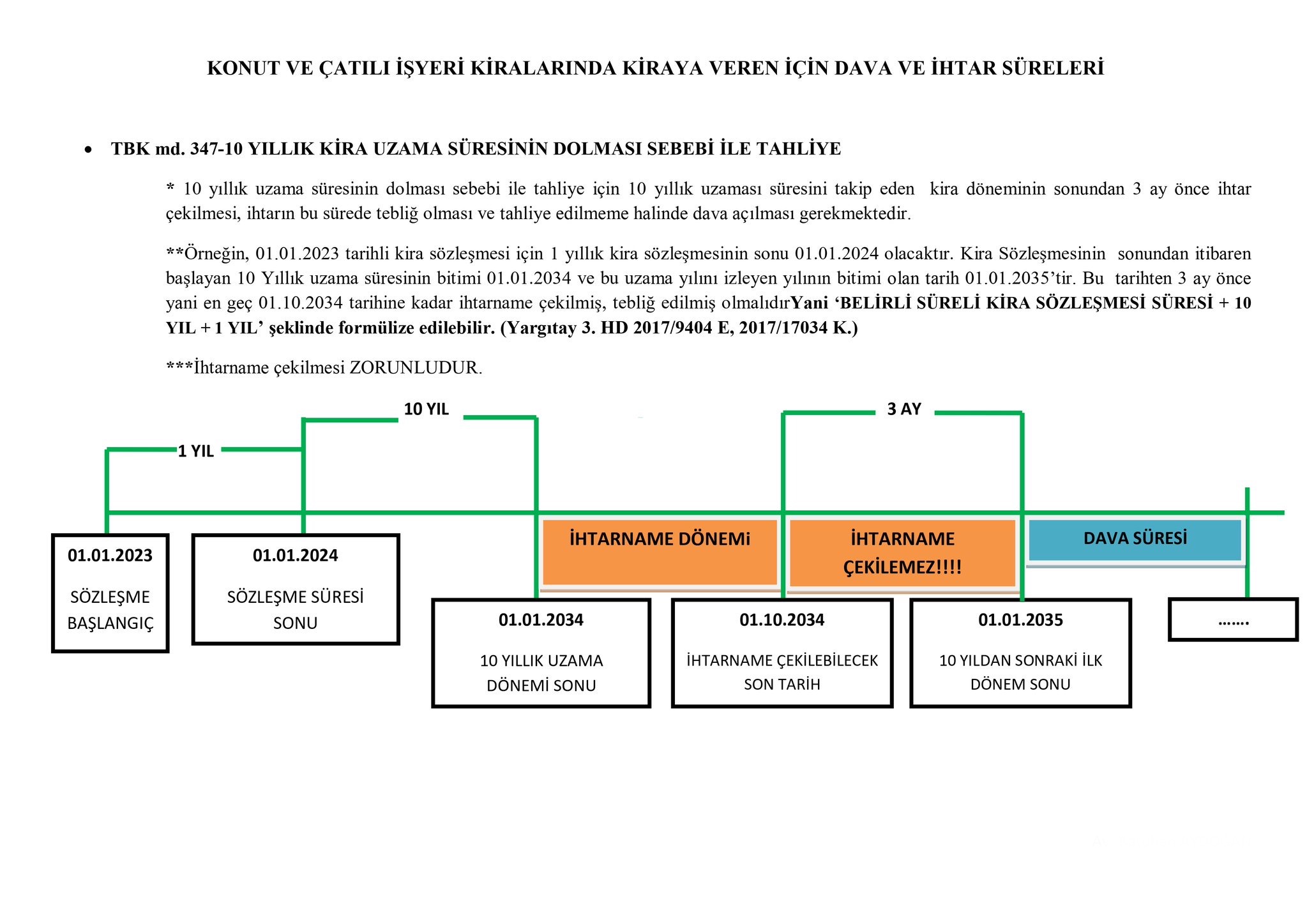 - Örneğin, 01.01.2023 tarihli kira sözleşmesi için 1 yıllık kira sözleşmesinin sonu 01.01.2024 olacaktır. Kira Sözleşmesinin sonundan itibaren başlayan 10 Yıllık uzama süresinin bitimi 01.01.2034 ve bu uzama yılını izleyen yılının bitimi olan tarih 01.01.2035'tir. Bu tarihten 3 ay önce yani en geç 01.10.2034 tarihine kadar ihtarname çekilmiş, tebliğ edilmiş olmalıdır.