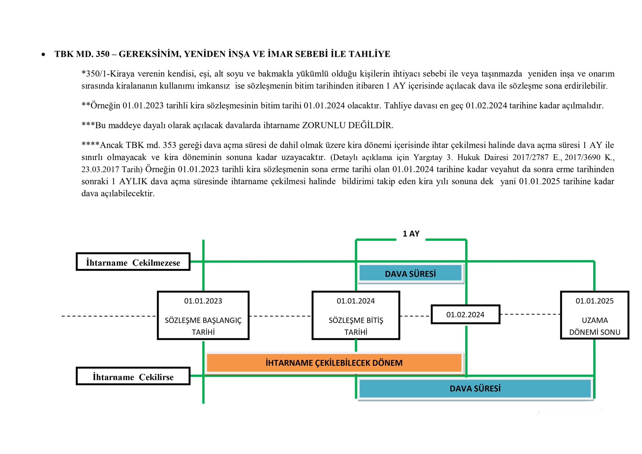 - 350/1-Kiraya verenin kendisi, eşi, alt soyu ve bakmakla yükümlü olduğu kişilerin ihtiyacı sebebi ile veya taşınmazda yeniden inşa ve onarım sırasında kiralananın kullanımı imkansız ise sözleşmenin bitim tarihinden itibaren 1 AY içerisinde açılacak dava ile sözleşme sona erdirilebilir.