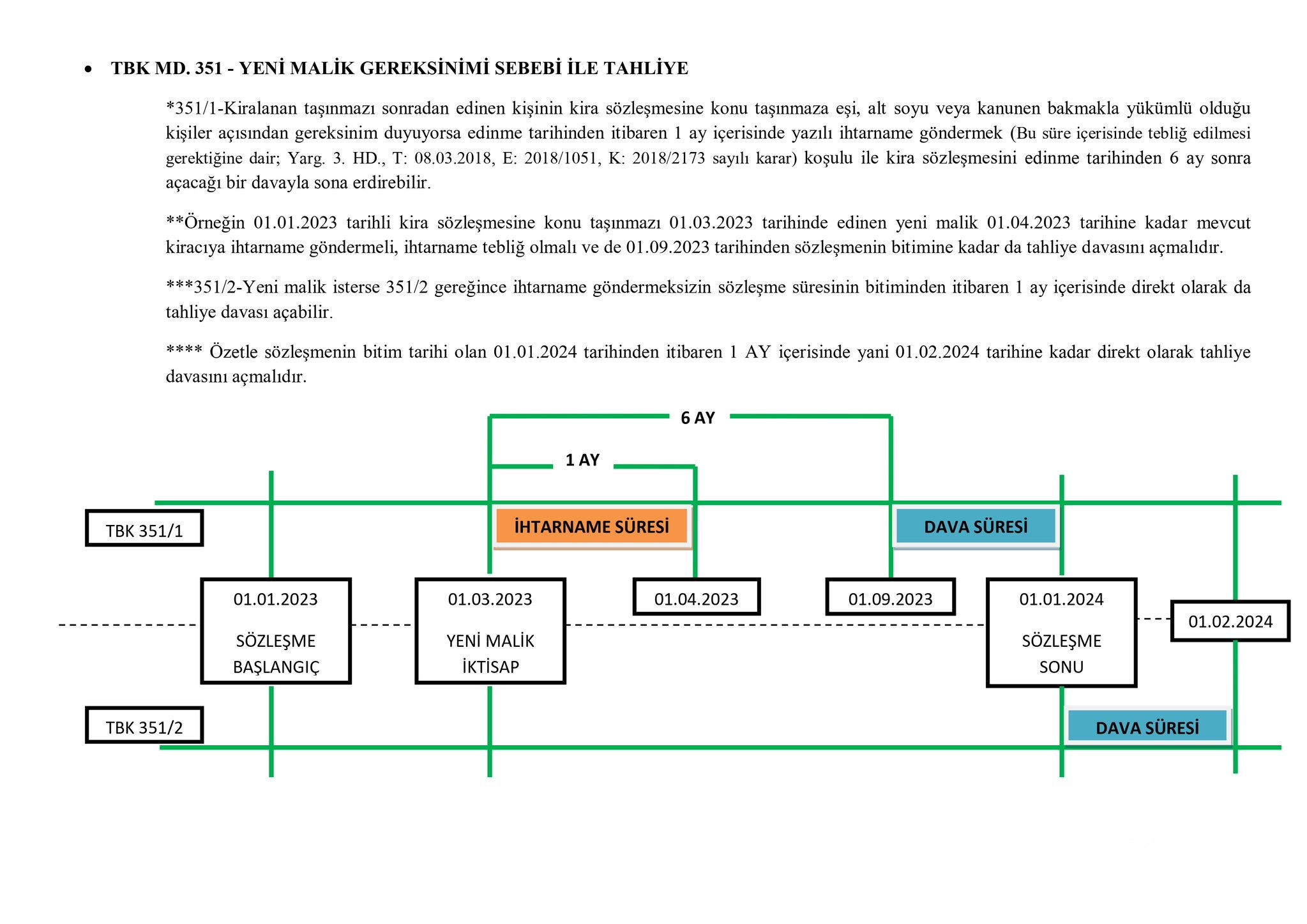 - 351/1-Kiralanan taşınmazı sonradan edinen kişinin kira sözleşmesine konu taşınmaza eşi, alt soyu veya kanunen bakmakla yükümlü olduğu kişiler açısından gereksinim duyuyorsa edinme tarihinden itibaren 1 ay içerisinde yazılı ihtarname göndermek (Bu süre içerisinde tebliğ edilmesi gerektiğine dair; Yarg. 3. HD., T: 08.03.2018, E: 2018/1051, K: 2018/2173 sayılı karar) koşulu ile kira sözleşmesini edinme tarihinden 6 ay sonra açacağı bir davayla sona erdirebilir.