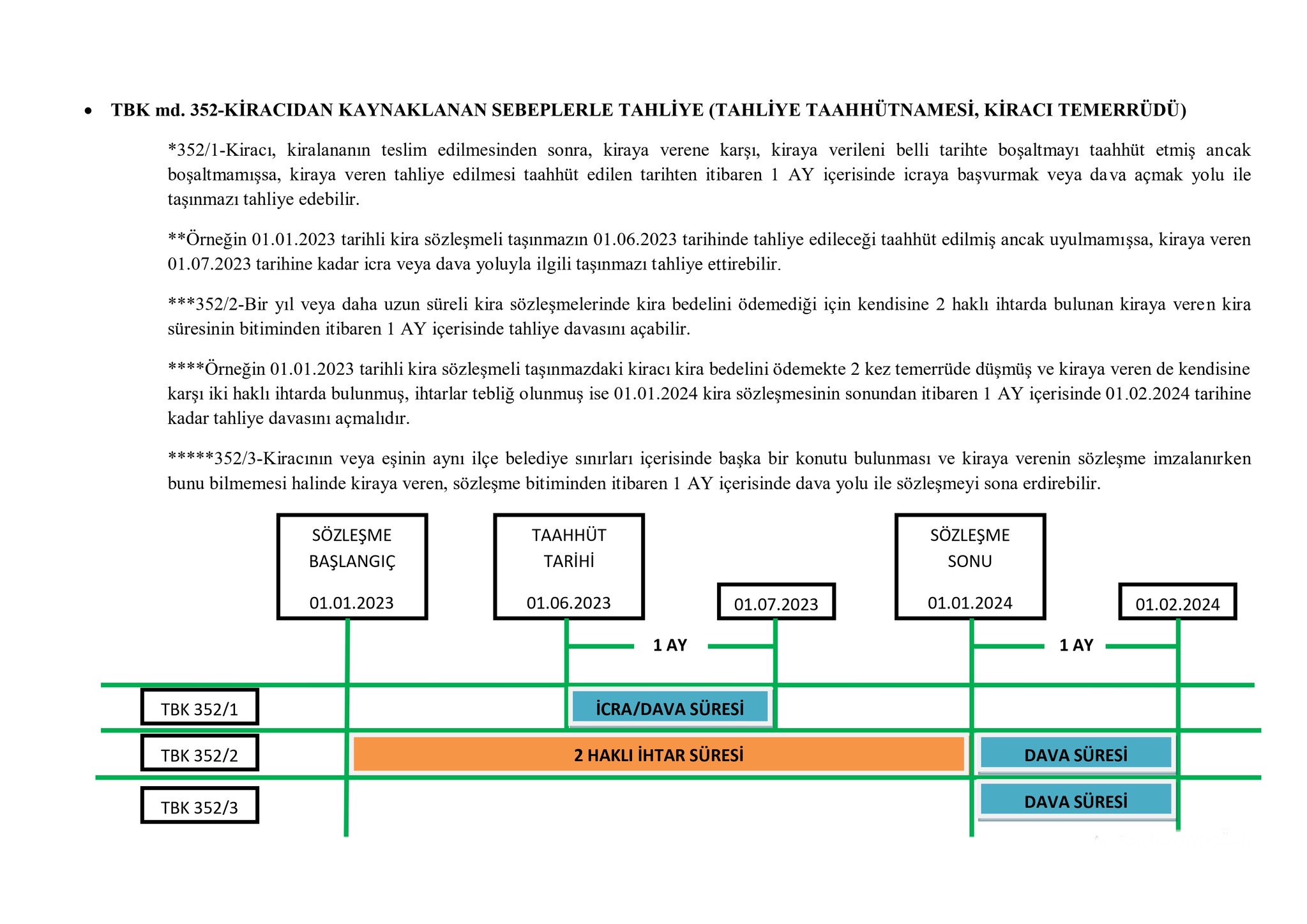 - 352/1-Kiracı, kiralananın teslim edilmesinden sonra, kiraya verene karşı, kiraya verileni belli tarihte boşaltmayı taahhüt etmiş ancak boşaltmamışsa, kiraya veren tahliye edilmesi taahhüt edilen tarihten itibaren 1 AY içerisinde icraya başvurmak veya dava açmak yolu ile taşınmazı tahliye edebilir.