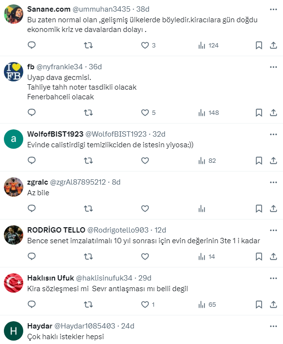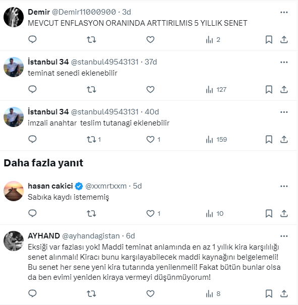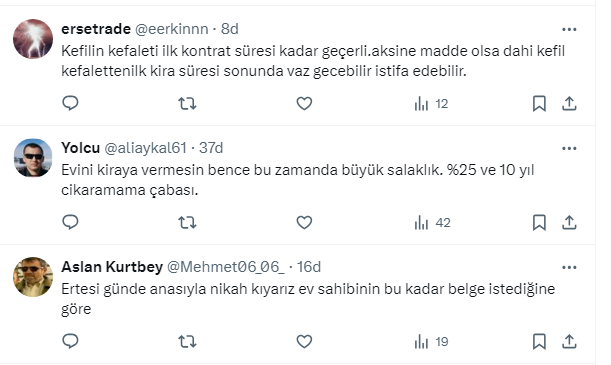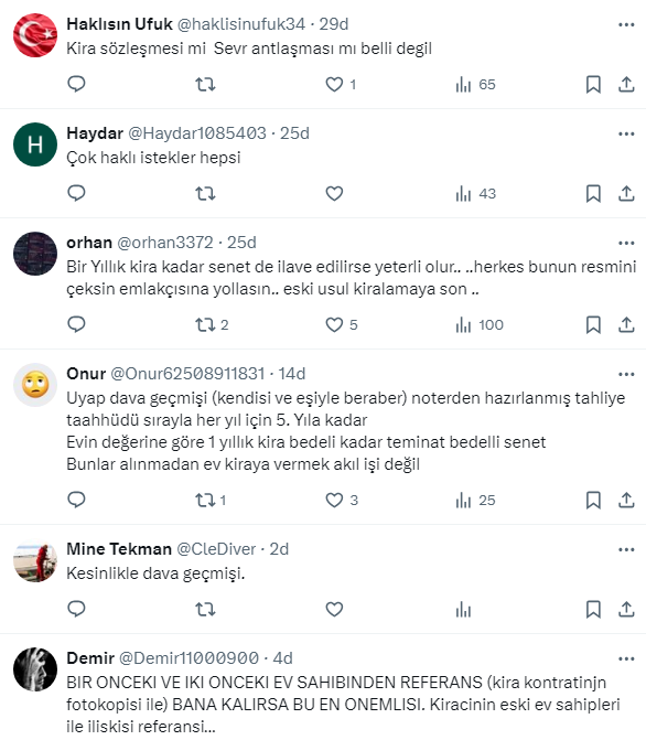 Ev sahipleri evlerini kiralarken bazı kriterlere dikkat etmesi gerekiyor.Evini kiralamadan önce, kiracıdan bazı belgelerin istenmesi gerekiyor. Peki bu belgeler neler? Ev kiralarken neye dikkat edilmeli? Kiracıdan hangi belgeler istenmeli? Hukukbilgiler sosyal medya hesabı X'ten kirama için istenilen belgeleri açıklayarak ev sahiplerine ''belgelere ilave almak istediğiniz bir belge var mı?'' diye sordu. Bakın ev sahiplerinden ne yanıtlar geldi. İşte o paylaşım ve gelen yorumlar..