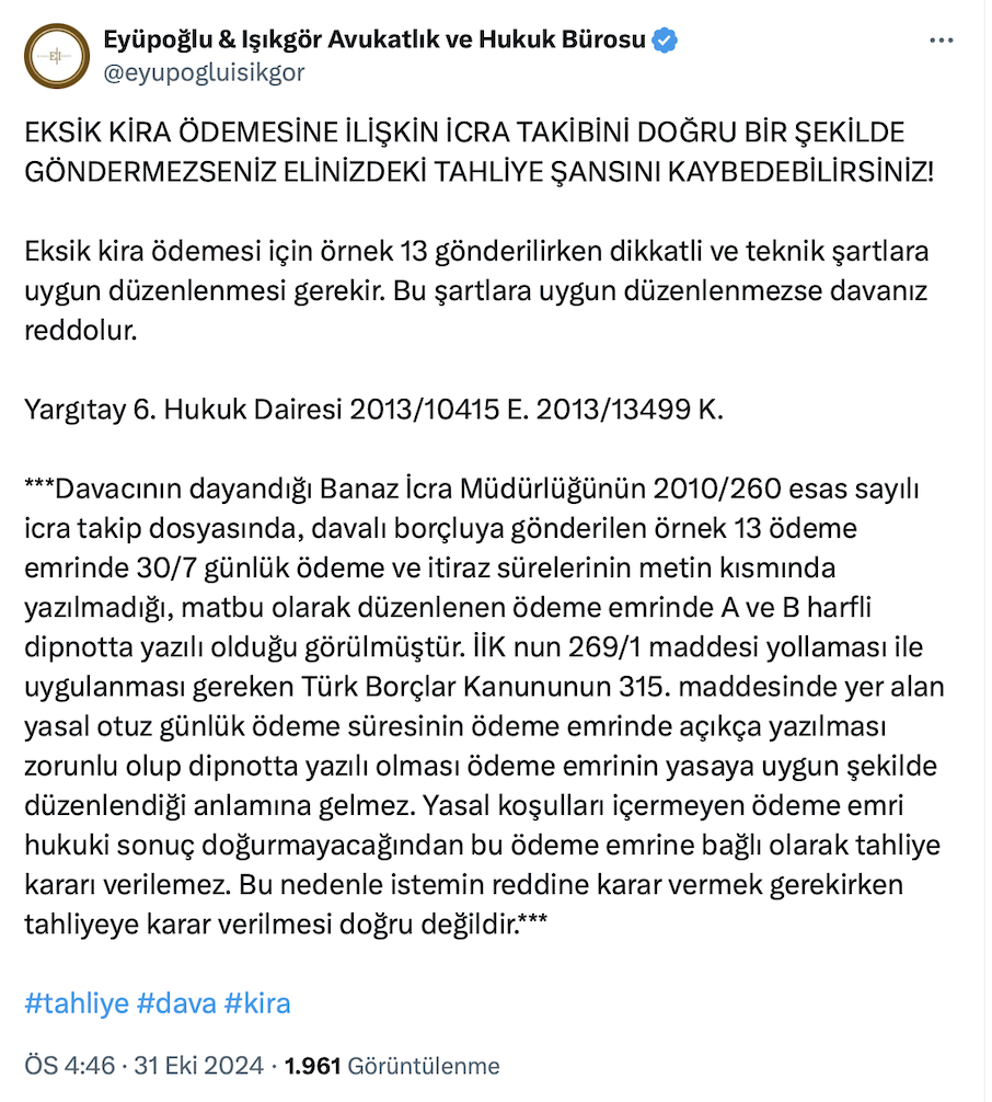 Eyüpoğlu - Işıkgör Avukatlık ve Hukuk Bürosu yaptığı paylaşımda ev sahiplerinin eğer eksik kira ödemesine ilişkin icra takibini doğru bir şekilde göndermezlerde ellerindeki tahliye şansını kaybedebileceğini belirtti.