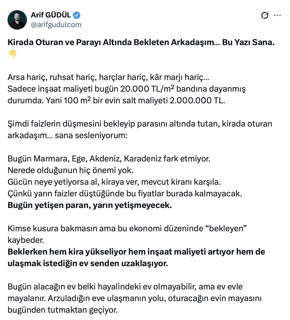 Toprak Yatırımcısı ve talepbul'un Yönetim Kurulu Başkanı Arif Güdül resmi sosyal medya hesabı üzerinden kirada oturan ve parayı altında bekletenler için çok önemli bir paylaşım yaptı. İşte o paylaşım…