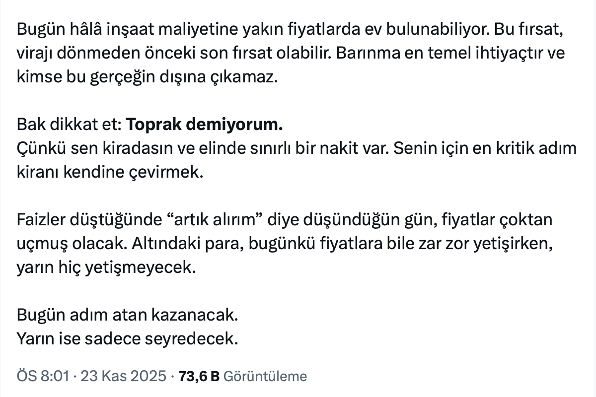 Bugün hâlâ inşaat maliyetine yakın fiyatlarda ev bulunabiliyor. Bu fırsat, virajı dönmeden önceki son fırsat olabilir. Barınma en temel ihtiyaçtır ve kimse bu gerçeğin dışına çıkamaz.