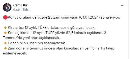 Konut kiralarında yüzde 25 zam sınırı yarın (01.07.2024) sona eriyor.