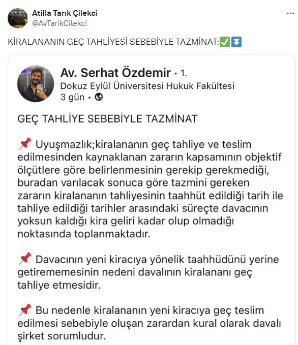 Av Atilla Çilekci sosyal medya hesabından kiralanın geç tahliyesi sebebiyle tazminat hakkına dair bilinmesi gerekenleri anlattı. İşte Çilekci'nin sosyal medya hesabı X'ten yaptığı o paylaşım...