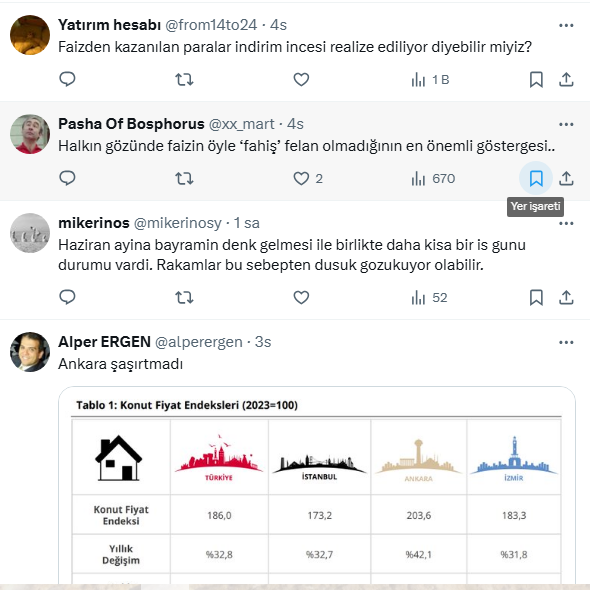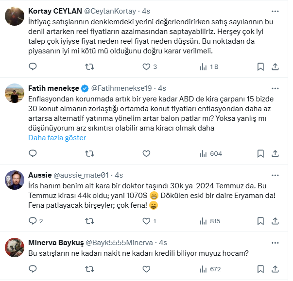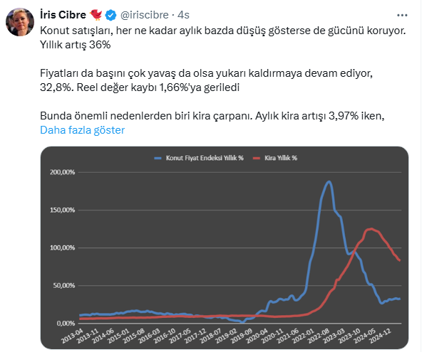 Ekonomist İris Cibre sosyal medya hesabı X'ten konut satışlarındaki artışa dikkat çekerek ''Kira artışları yüksek oldukça satışlar da hızlı devam edecektir.' açıklamasını yaptı.