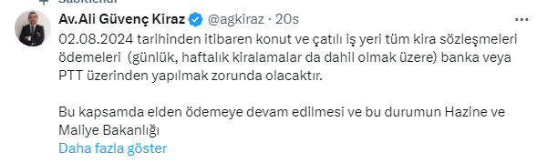 02.08.2024 tarihinden itibaren konut ve çatılı iş yeri tüm kira sözleşmeleri ödemeleri (günlük, haftalık kiralamalar da dahil olmak üzere) banka veya PTT üzerinden yapılmak zorunda olacaktır.