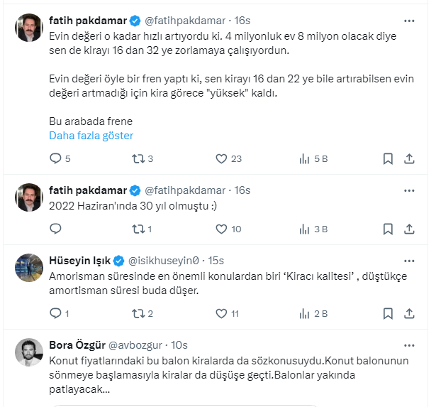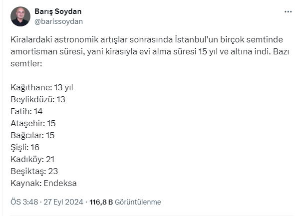 Ekonomist Barış Soydan sosyal medya hesabından kira artışlarına ve beraberinde amortisman sürelerine değindi. Soydan, kira artışları ile İstanbul'da amortisman süresinin 15 yıl ve altına indiğini açıkladı. İşte Barış Soydan'ın o paylaşımı ve gelen yorumlar...