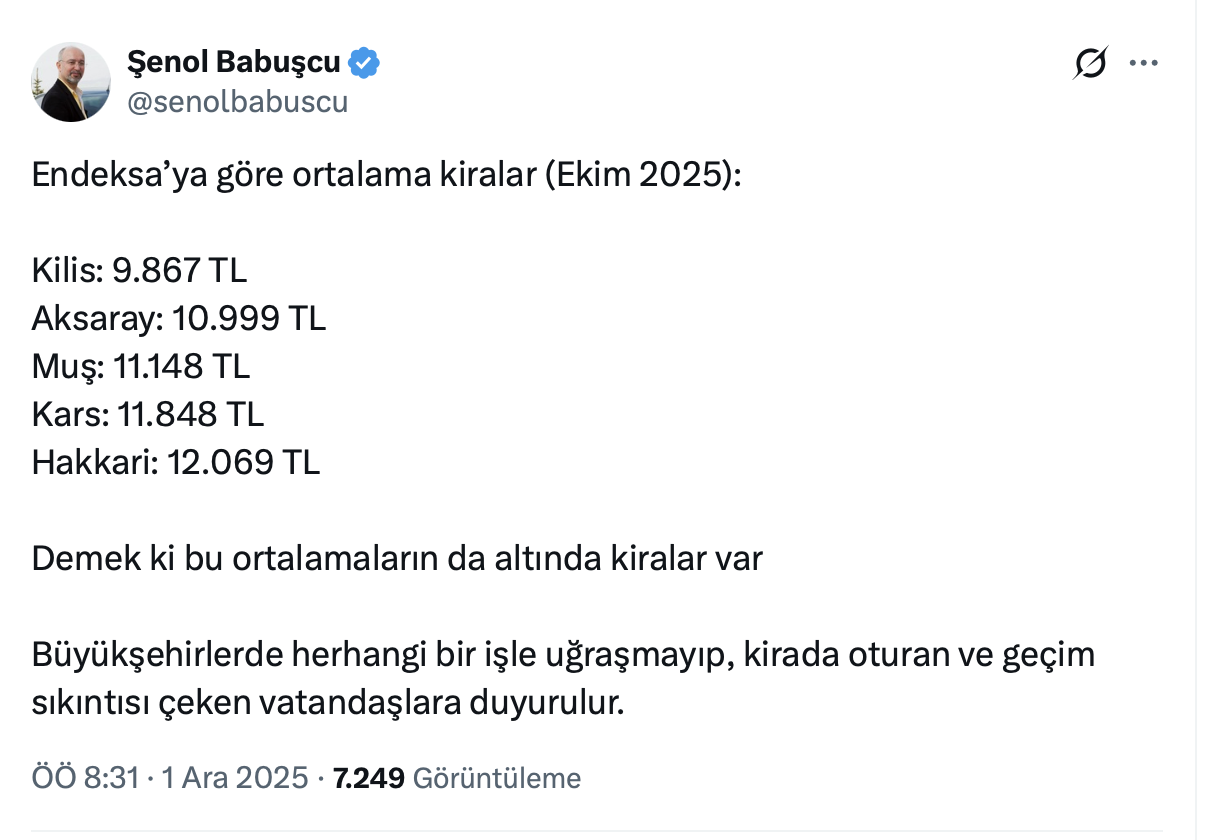 Şenol Babuşcu sosyal medya hesabı üzerinden kiraların 13 bin TL’nin altında olduğu 5 ili paylaştı.