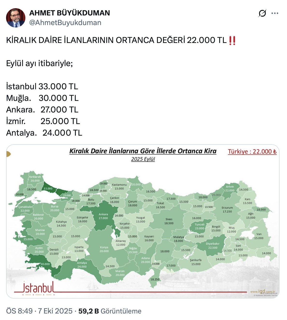 Ahmet Büyükduman resmi X hesabı https://x.com/AhmetBuyukduman üzerinden yaptığı paylaşımda kiralık daire ilanlarının ortanca değerinin 22 bin TL olduğunu belirtti.