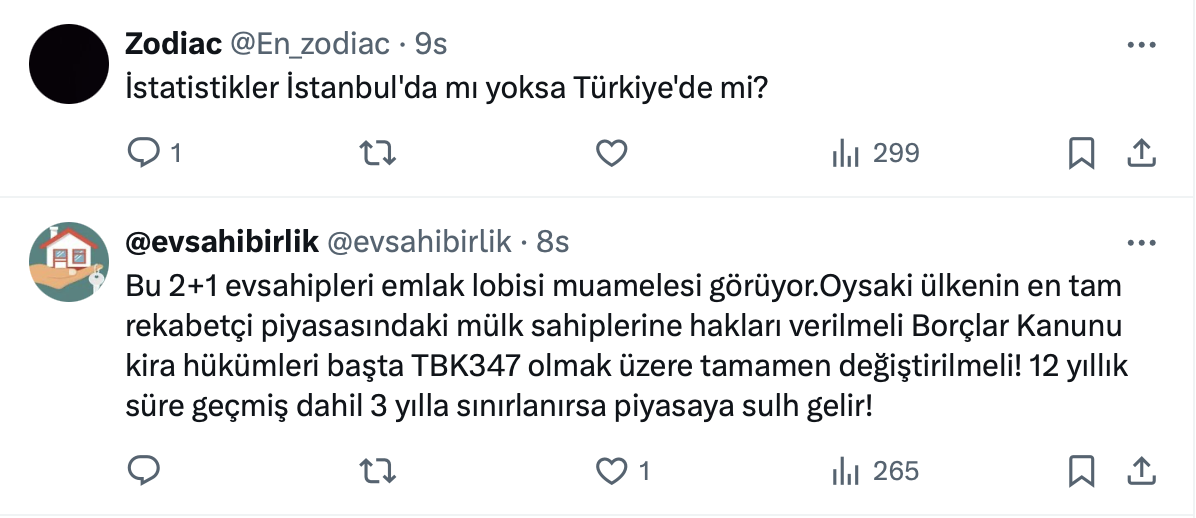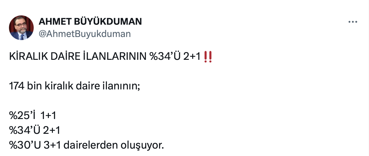 Ahmet Büyükduman resmi X hesabı https://x.com/AhmetBuyukduman üzerinden yaptığı paylaşımda kiralık daire ilanlarının yüzde 34’ünün 2+1 olduğunu belirtti.