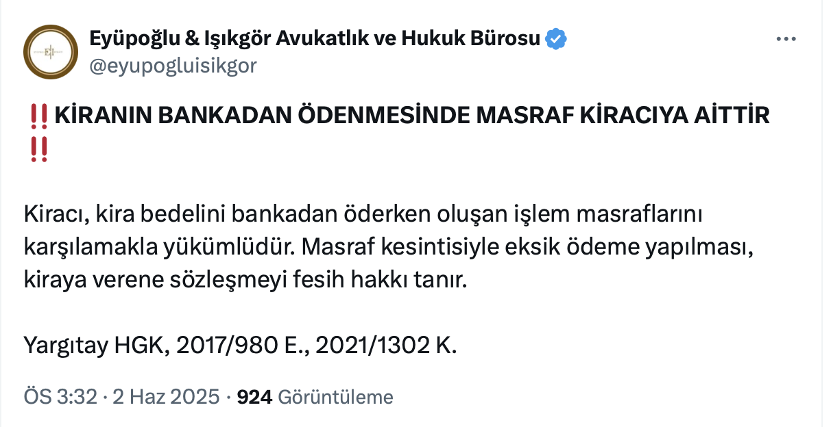Resmi X hesabında sık sık konut sahibi ve kiracı hakları ile ilgili paylaşımlara yer veren Eyüpoğlu - Işıkgör Avukatlık ve Hukuk Bürosu https://x.com/eyupogluisikgor üzerinden bu defa da “Kiranın bankadan ödenmesinde masraf kime aittir?” Sorusuna yanıt verdi.