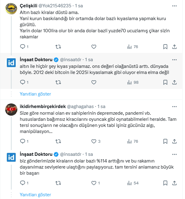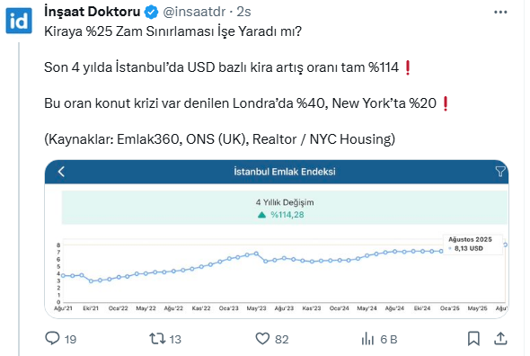 Konut piyasasına dair paylaşımları ile dikkatleri üzerine çeken İnşaat doktoru, bugün sosyal medya hesabından yüzde 25 kira zam sınırlamasının işe yaramadığını ve kiraların dolar bazlı yüzde 114 arttığını kaynaklarla açıkladı.