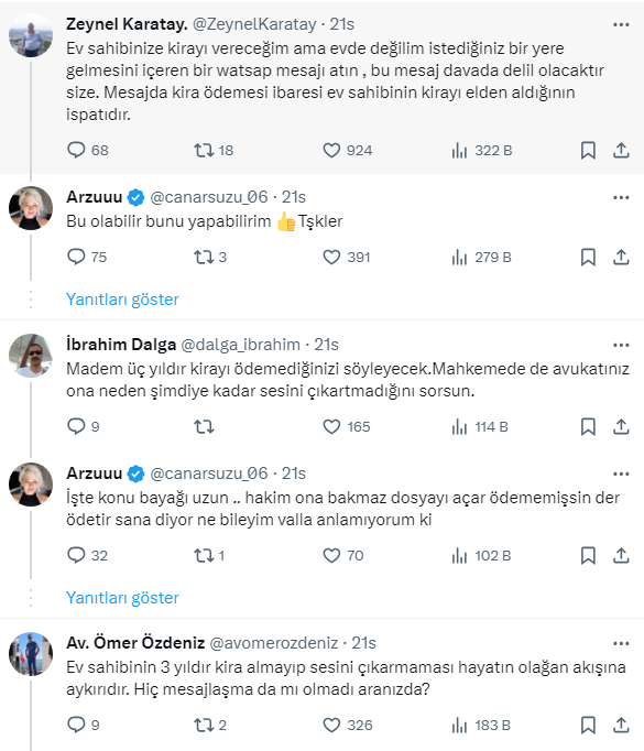 Kira ödemeleri konusunda, son zamanlarda gelen haberler şaşkınlık yaratıyor. Canar Suzu adlı twitter X takipçisi ev sahibi ile ilgili arasında geçen diyoloğu anlattı. Elden yaptığı kiralar için ev sahibin vergi kaçırdığını ve kendisini şikaet edeceğini söylediğinde ev sahibi '' Bende seni kiralarını ödemedin diye şikayet eder, tüm kiraları sil baştan alırım'' dedi. Konu üzerine araştırma yapan Canar Suzu, ev sahibinin doğru söylediğini öğrendi. Konuyla ilgili olarak kira ilişkisini düzenleyen kanunda şu vardır: Kira bedelleri resmiyette bankalardan yatırılması gerekmektedir. Bankadan yatırılmadıysa diğer bir yazılı delil kirayı aldığına dair mal sahibinin verdiği bir yazılı evrak olmalı. Kararın burada kiracı aleyhine verilmesinin sebebi de budur. Ne bir banka dekontu ne de kiracının aylık kiralarını ödediğine dair bir belge yoktur. Bundan dolayı kabul görmemesi gayet normal ve doğaldır.