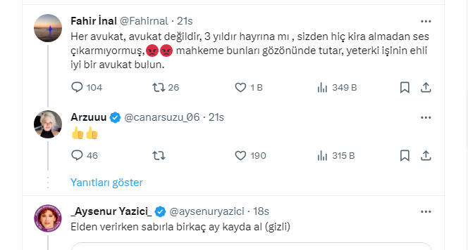 Fahir İnal @Fahirnal: ''Her avukat, avukat değildir, 3 yıldır hayrına mı , sizden hiç kira almadan ses çıkarmıyormuş, mahkeme bunları gözönünde tutar, yeterki işinin ehli iyi bir avukat bulun.