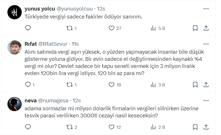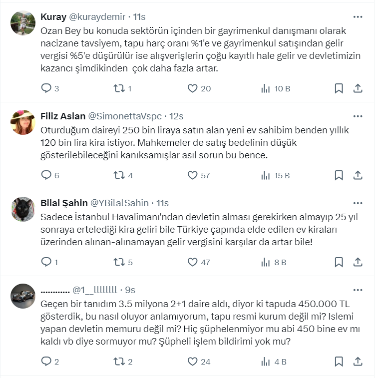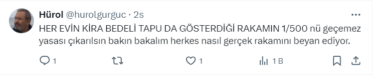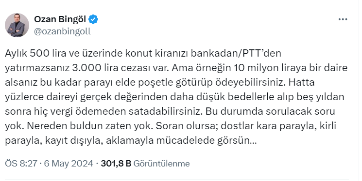Vergi Uzmanı Ozan Bingöl resmi X hesabı https://twitter.com/ozanbingoll üzerinden yaptığı paylaşımda "Aylık 500 lira ve üzerinde konut kiranızı bankadan/PTT’den yatırmazsanız 3.000 lira cezası var. Ama örneğin 10 milyon liraya bir daire alsanız bu kadar parayı elde poşetle götürüp ödeyebilirsiniz" ifadelerini kullandı.