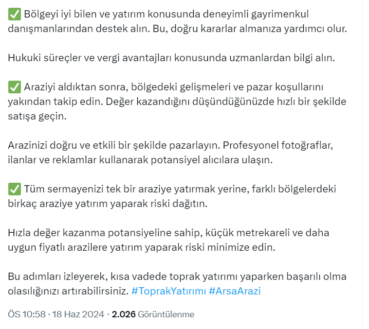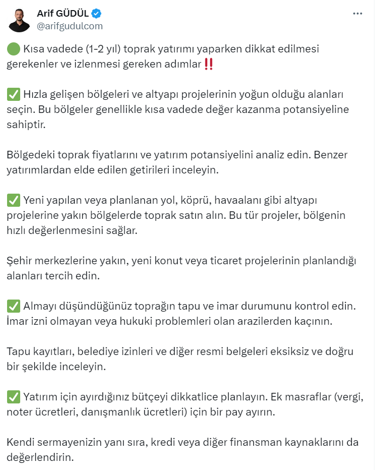 Arsa ve arazinin yıldızının parladığı şu günlerde Toprak Yatırımcısı ve talepbul'un Yönetim Kurulu Başkanı Arif Güdül resmi X hesabı https://x.com/arifgudulcom üzerinden resmi sosyal medya hesabı üzerinden kısa vadede (1-2 yıl) toprak yatırımı yaparken dikkat edilmesi gerekenler ve izlenmesi gereken adımları açıkladı.
