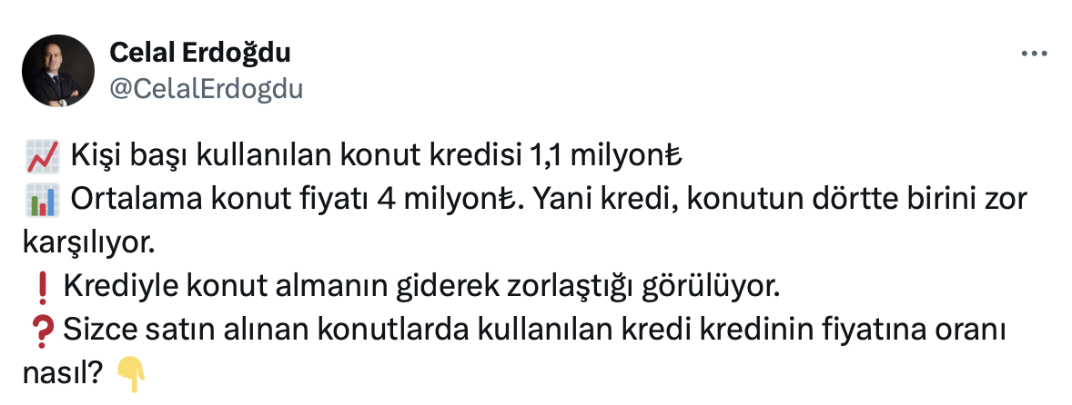 Konut kredileri gündemden düşmezken Şehir Plancısı ve Gayrimenkul Değerleme Uzmanı Celal Erdoğdu da resmi X hesabı https://twitter.com/CelalErdogdu üzerinden konu ile ilgili bir paylaşım yaptı.
