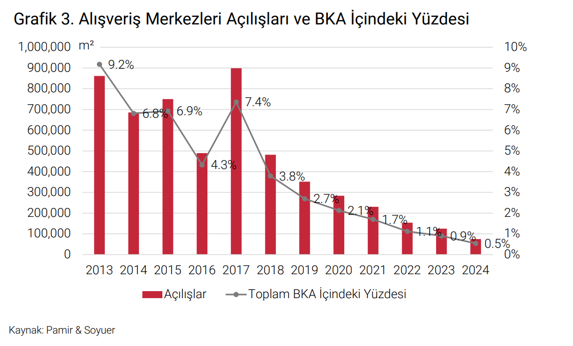 Pamir-Soyuer 2024 yılı 1. çeyrek Türkiye Gayrimenkul Sektörü raporuna göre, kişi başına düşen kiralanabilir AVM alanı, Türkiye genelinde 162,38 m²/1000 kişi olarak hesaplandı. İşte rapordan öne çıkan satır başları...