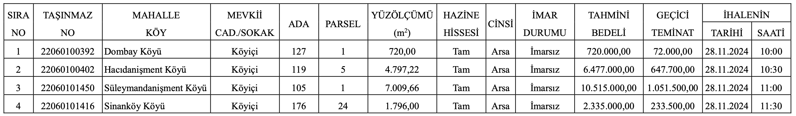 Lalapaşa Milli Emlak Şefliği tarafından satışa çıkarılan ve Edirne’de yer alan arsaların yüz ölçümleri 720 metrekare ile 7 bin 9 metrekare arasında değişiyor.