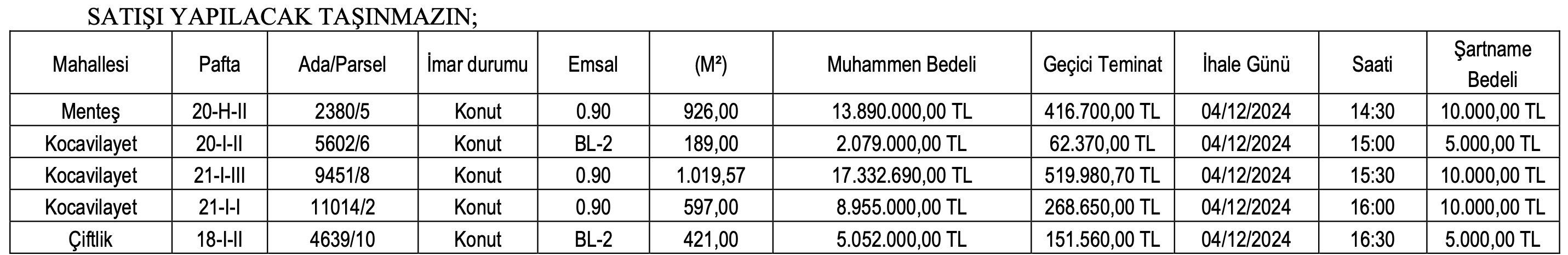 Menteş, Kocavilayet ve Çiftlik mahallelerinde yer alan arsaların satış ihaleleri 4 Aralık 2024 tarihinde saat 14.30 ile 16.30 arasında Yenişehir Belediyesi Encümen Salonu’nda gerçekleştirilecek.