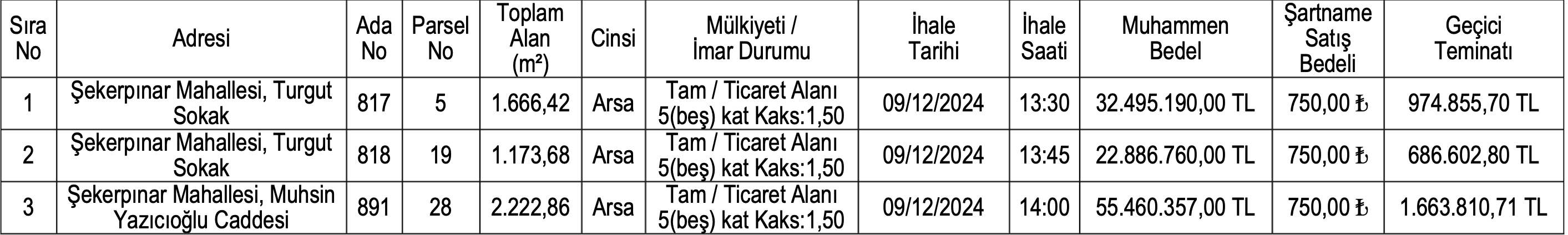 Muhammen bedellerin 2 milyon 79 bin TL ile 17 milyon 332 bin 690 TL arasında değiştiği arsalar için ödenecek geçici teminat bedelleri de 62 bin 370 TL ile 416 bin 700 TL arasında değişiyor.