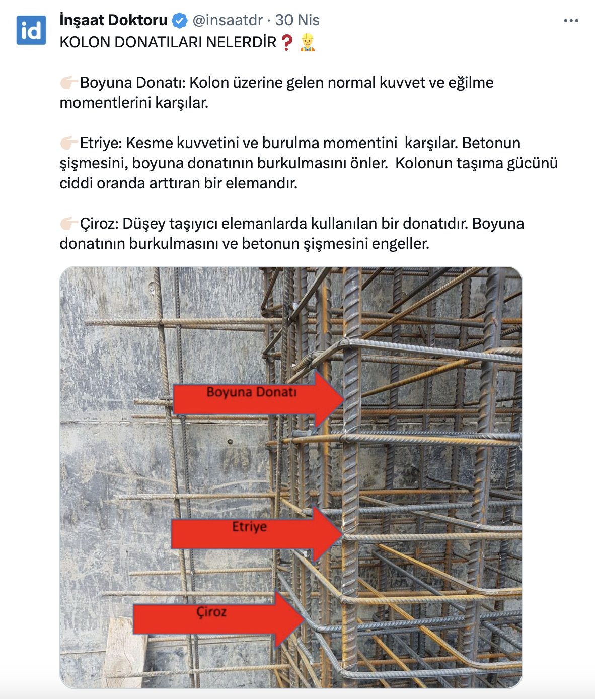 İnşaat Doktoru resmi X hesabı https://twitter.com/insaatdr üzerinden yaptığı paylaşımda kolon donatılarının neler olduğunu açıkladı.