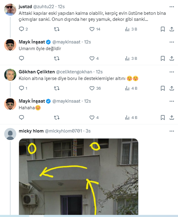 Ülenin dört bir yanından inşaat kurallarını hiçe sayan ve tehlike şaçan bina fotoğtafları gelmeye devam ediyor. Kocaeli Çayırova'da bir binada kolon yerine su borusu yapıldı, görenler neye uğradığını şaşırdı. İnsan hayatını hiçe sayan bu fotoğraflar Akademisyen İnşaat Mühendisi Mayk İnşaat'tan geldi. Mayk İnşaat sosyal medya hesabı X'ten binanın foroğtaflarını paylaşarak vatandaşların yorumlarını dinledi. Mayk İnşaat, bina için 'sudan çözüm' yorumu yaptı. Peki vatandaşlar ne dedi? İşte o paylaşım ve gelen yorumlar...
