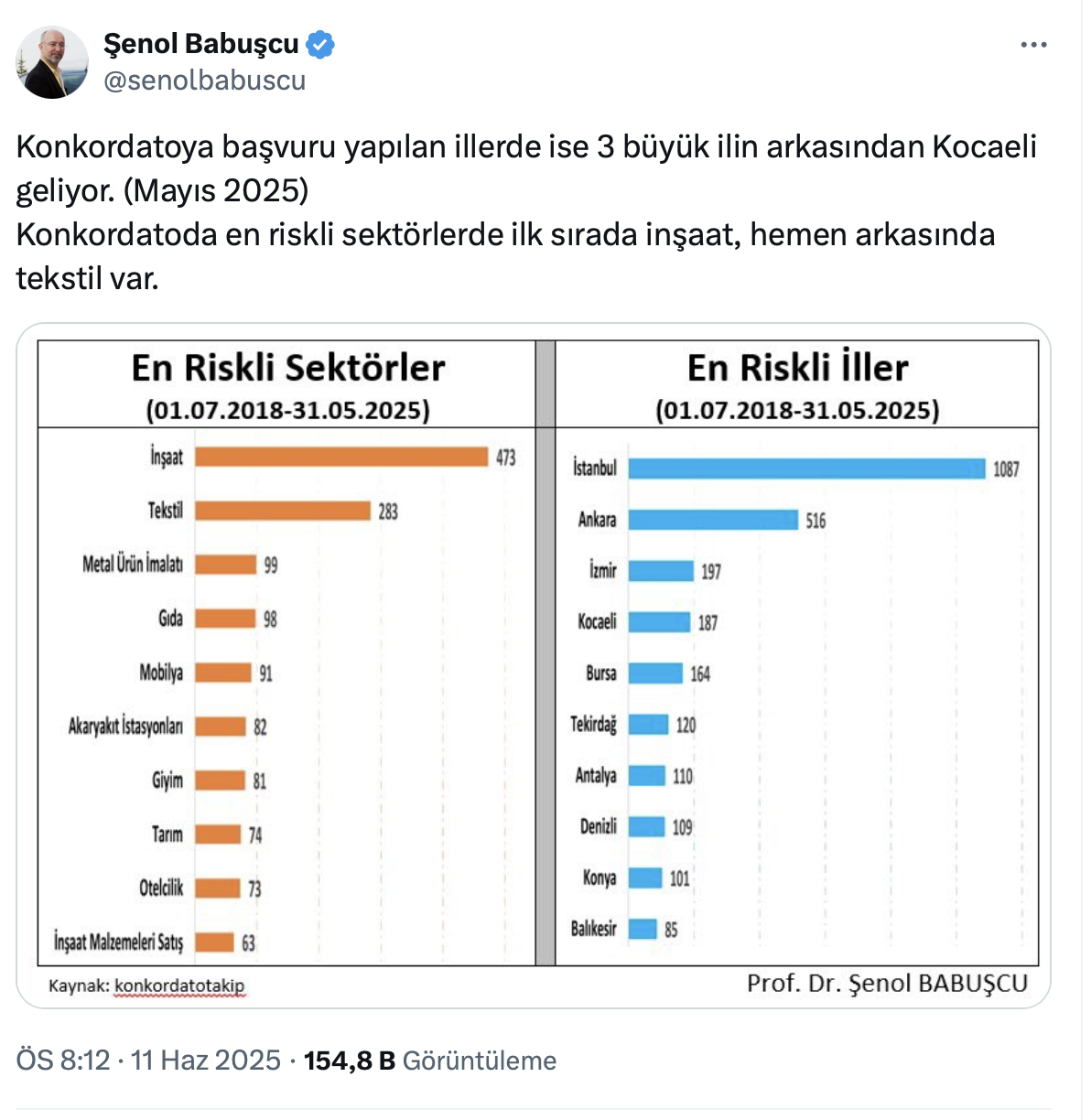 Başkent Üniversitesi Uluslararası Finans ve Bankacılık Bölüm Başkanı ve Ziraat Bankası eski Genel Müdür Yardımcısı Prof. Dr. Şenol Babuşcu resmi X hesabı https://x.com/senolbabuscu üzerinden yaptığı paylaşımda konkordatoda en riskli sektörlerde ilk sırada inşaat olduğunu söyledi.