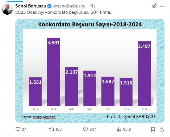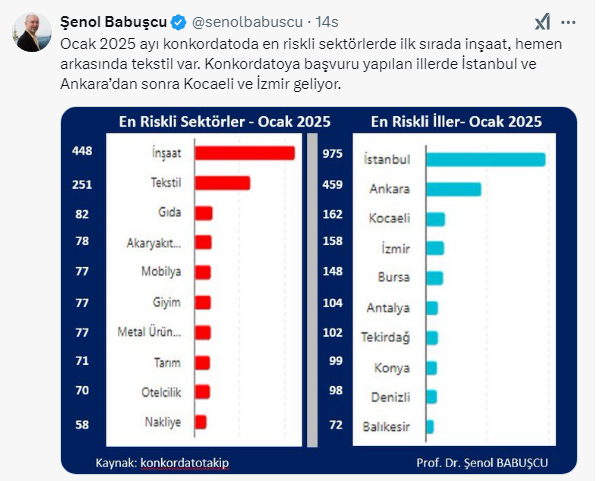 Ziraat Bankası eski Genel Müdür Yardımcısı ve Başkent Üniversitesi Uluslararası Finans ve Bankacılık Bölüm Başkanı Prof. Dr. Şenol Babuşcu, https://x.com/senolbabuscu X sosyal medya hesabı üzerinden son 5 yıllık konkordato verilerini paylaşarak en riskli sektörün inşaat olduğun söyledi. Babuşcu paylaşımında, “Ocak 2025 ayı konkordatoda en riskli sektörlerde ilk sırada inşaat, hemen arkasında tekstil var. Konkordatoya başvuru yapılan illerde İstanbul ve Ankara’dan sonra Kocaeli ve İzmir geliyor” dedi.