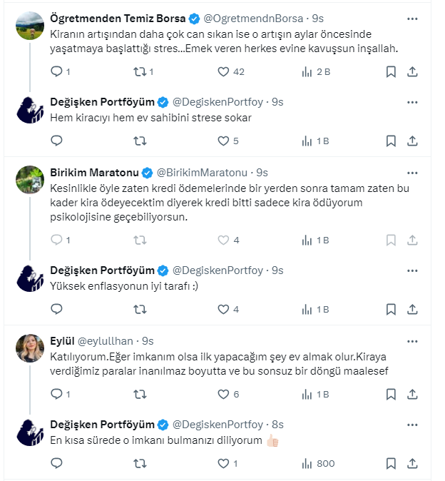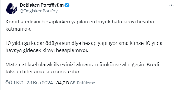 Değişken Portföyüm, sosyal medya hesabı X'ten kredi ile ev almak isteyenleri uyardı. Değişken Portföyüm, ''Konut kredisini hesaplarken yapılan en büyük hata kirayı hesaba katmamak.' dedi ve kimsenin 10 yılda havaya gidecek kirayı hesaplamadığını söyledi. İşte o paylaşım ve gelen yorumlar...