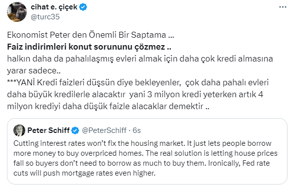 Girişimci Cihat E. Çiçek, sosyal medya hesabından, dünyaca ünlü ekonomist Peter Schiff'in faiz indirimiyle ilgili paylaşımını alıntılayarak ''Ekonomist Peter den önemli bir saptama, faiz indirimleri konut sorununu çözmez'' açıklaması geldi.