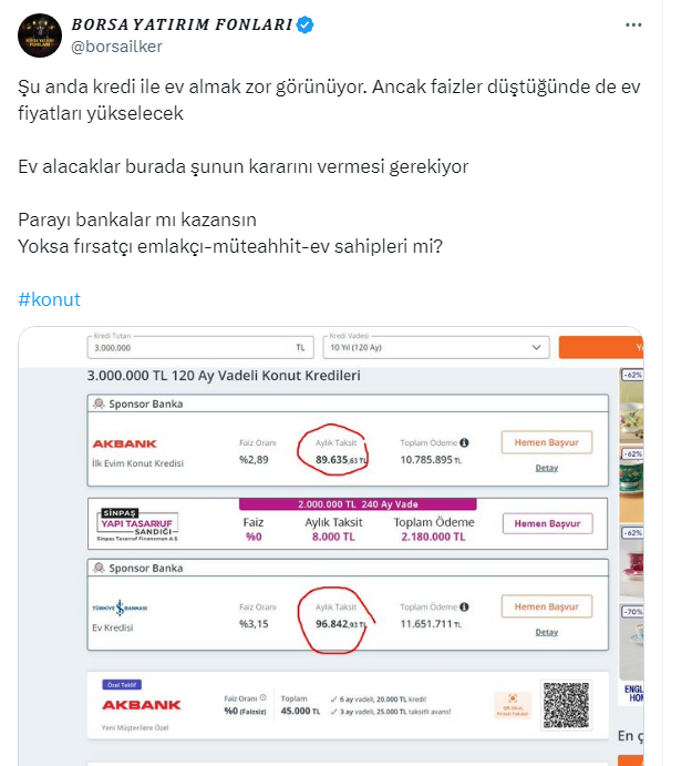 Borsa yatırım fonları isimli sosyal medya X kullanıcısı şu anda kredi ile ev almanın zor olduğunu ancak faizler düştüğünde de ev fiyatlarının yükseleceğini açıkladı. Geçtiğimiz günlerde Ziraat Bankası'nın konut kredisi faizini 2,79 'a düşürmesi ile fırsatçı emlakçılar hemen konut fiyatlarını artırmaya başladı. İlanlardaki fiyatlar günlük olarak değişmneye başladı.