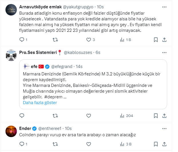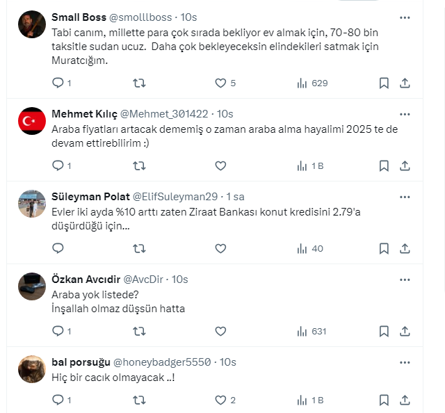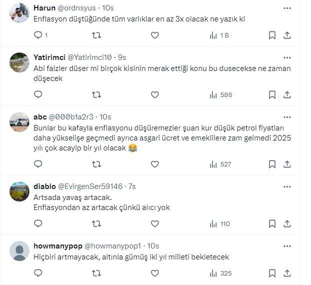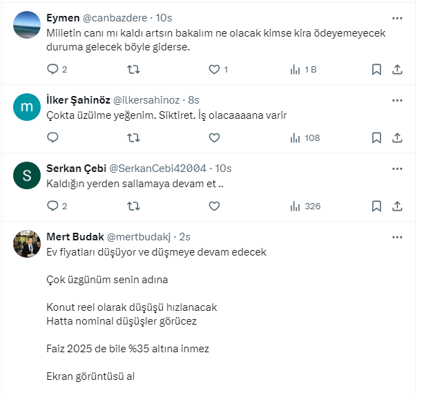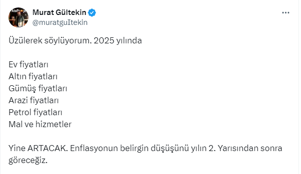 Gayrimenkul uzmanı Murat Gültekin, https://x.com/muratguItekin X sosyal medya hesabından yaptığı paylaşımda 2025 yılında fiyat artışlarının süreceğini işaret ederek, “Üzülerek söylüyorum. 2025 yılında ev fiyatları, altın fiyatları, gümüş fiyatları, arazi fiyatları, petrol fiyatları, mal ve hizmetler yine artacak. Enflasyonun belirgin düşüşünü yılın 2. Yarısından sonra göreceğiz” dedi.