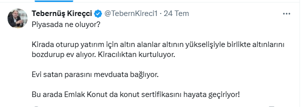 İşte Tebernüş Kireçci'nin sosyal medya hesabı X'ten piyasalar hakkındaki o değerlendirmesi...