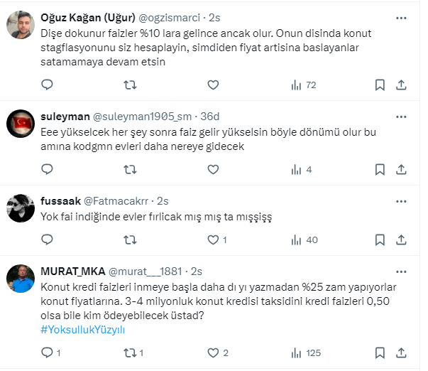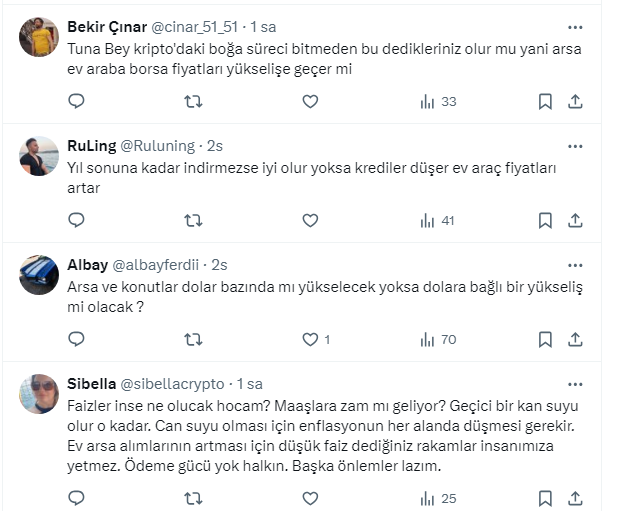 Tuna Kaya paylaşımanda, “Türkiye ekonomisinde büyüme sıfıra indiğinde başlar kanısındayım. Bu da ya 2024 aralık ya da 2025 mart aylarını gösteriyor. Faizler inmeye başladığında konut, arsa, borsa yükselecek.”