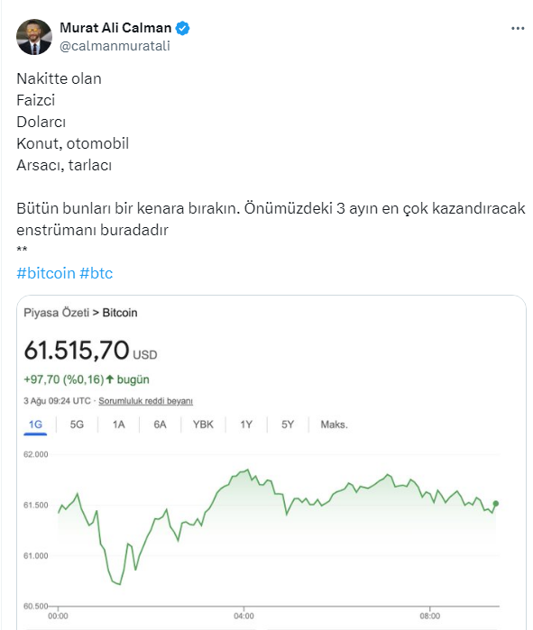 Kripto fenomeni Murat Ali Calman, sosyal medya hesabı X'ten önümüzdeki 3 ay içinde ne çok kazandıran yatırım aracını açıklayarak yatırımcıları uyardı. Calman, yatırımcısına en çok kazandıracak yatırım aracının bitcoin olduğunu söyledi. İşte o paylaşım ve gelen yorumlar...