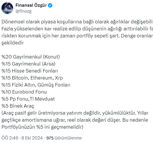 Finansal Özgür, yatırımcılar için yatırım enstrümanlarında denge oranları belirledi. İşte o paylaşım...