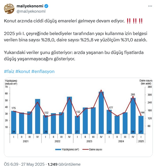 Maliye Ekonomi isimli sosyal medya X kullancısı, sosyal medya hesabından, konut arzında ciddi düşüş olduğunu açıkladı ve bu düşüş eğiliminin konut fiyatlarına yansımayacağını söyledi. Analist, sosyal medya hesabından daire sayısı ve yüzölçümü verilerinin yer aldığı grafiği paylaşarak önemli değerlendirmelerde bulundu.