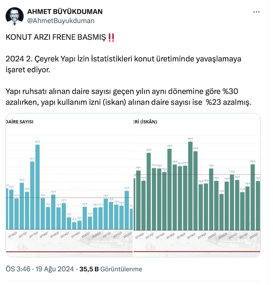 Gayrimenkul Değerleme Uzmanı Dr. Ahmet Büyükduman resmi X hesabı https://x.com/AhmetBuyukduman üzerinden yaptığı paylaşımda 2024 2. Çeyrek Yapı İzin İstatistikleri konut üretiminde yavaşlamaya işaret ettiğini belirterek, “Yapı ruhsatı alınan daire sayısı geçen yılın aynı dönemine göre yüzde 30 azalırken, yapı kullanım izni (iskan) alınan daire sayısı ise yüzde 23 azalmış.” İfadelerini kullandı.