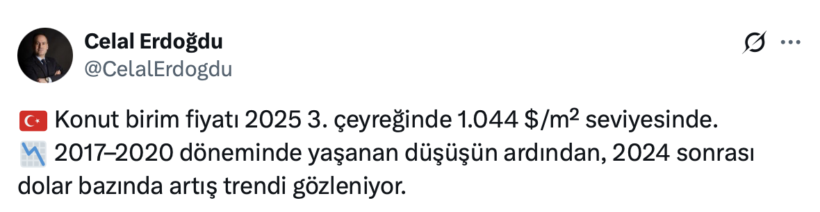 Celal Erdoğdu sosyal medya hesabı üzerinden yaptığı paylaşımda konut birim fiyatının 2025 3. çeyreğinde bin 44 dolar/metrekare seviyesinde olduğunu belirtti.