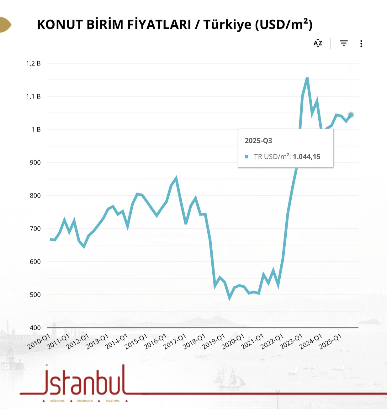 Konut birim fiyatı 2025 3. çeyreğinde 1.044 $/m² seviyesinde.